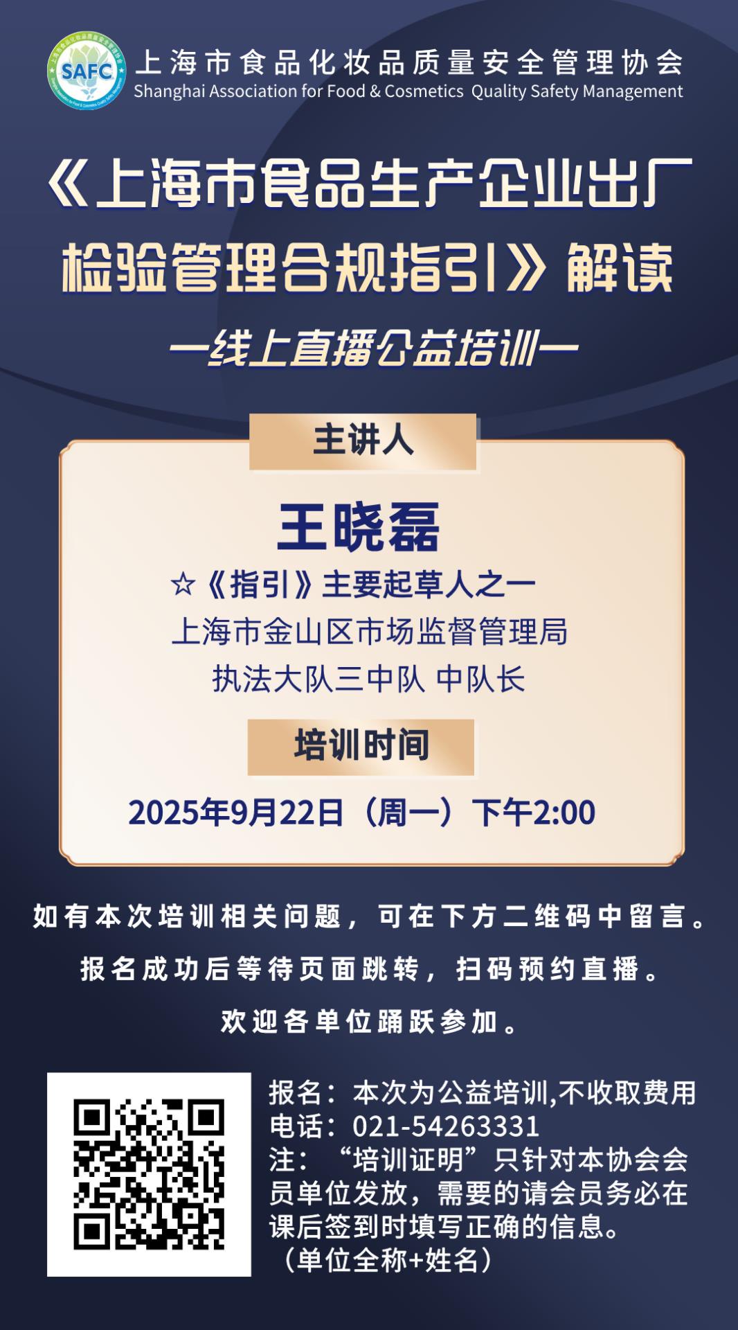 【公益培训】《上海市食品生产企业出厂检验管理合规指引》解读 线上直播公益培训——2025年9月22日 14:00