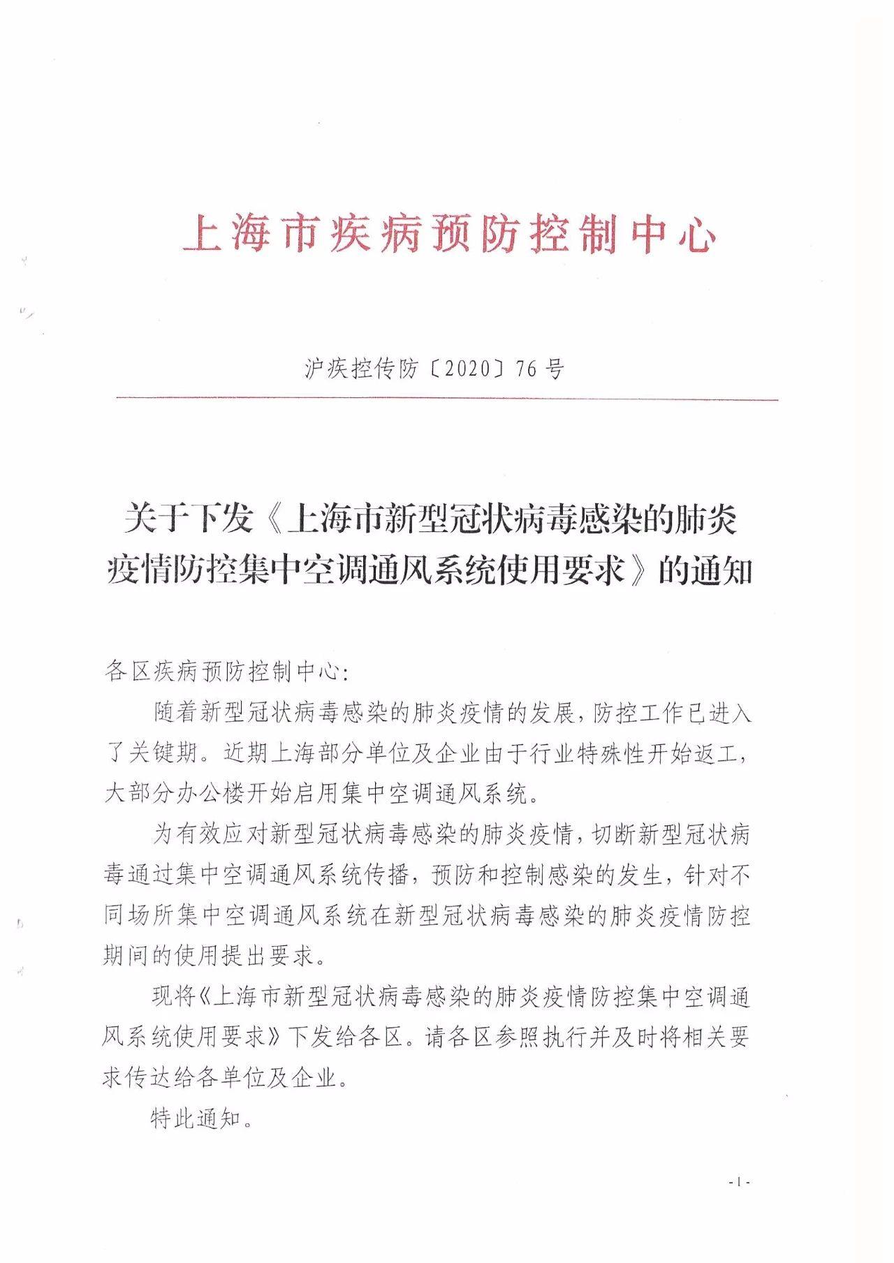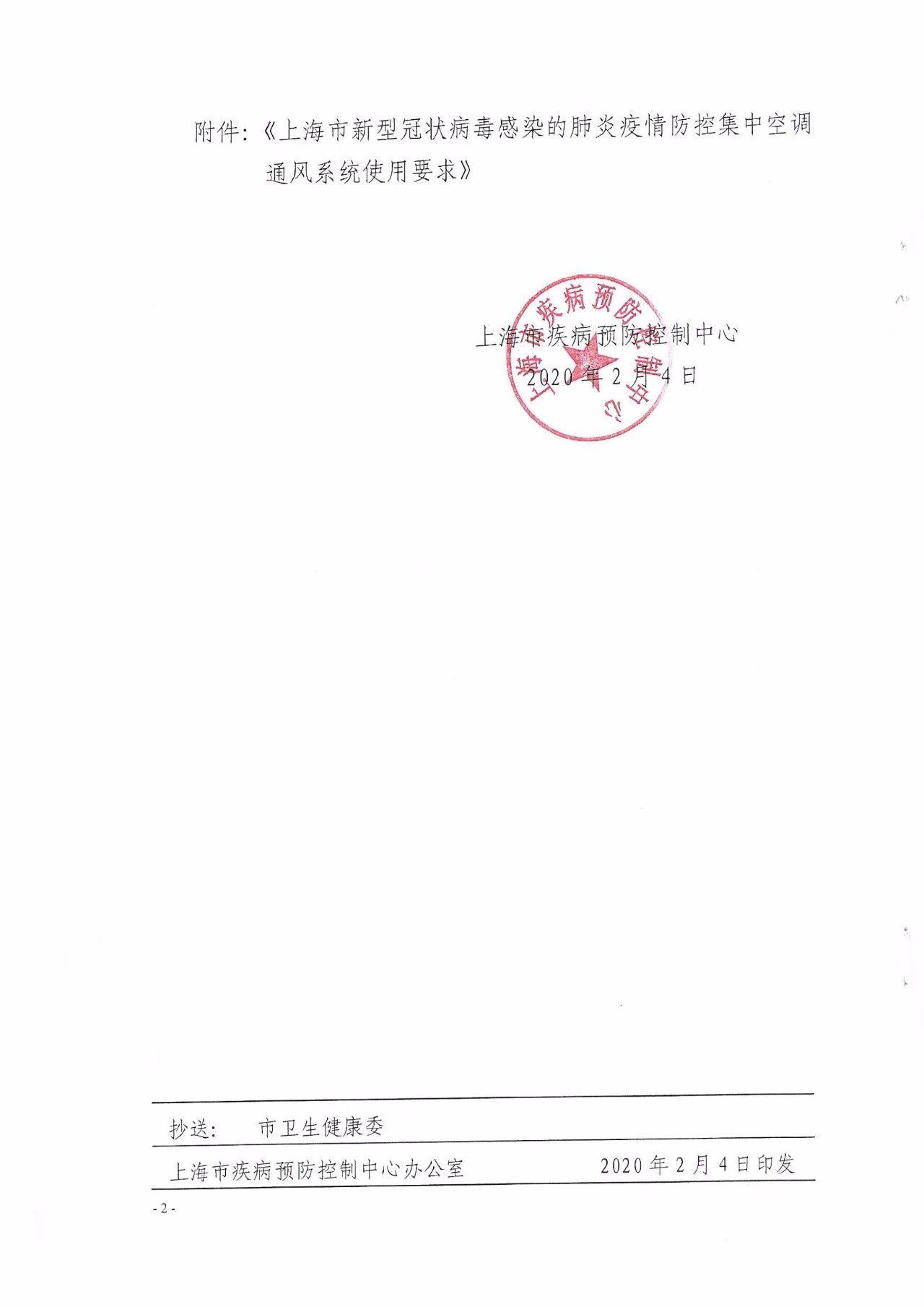 上海市疾病预防控制中心关于下发《上海市新型冠状病毒感染的肺炎疫情防控集中空调通风系统使用要求》的通知