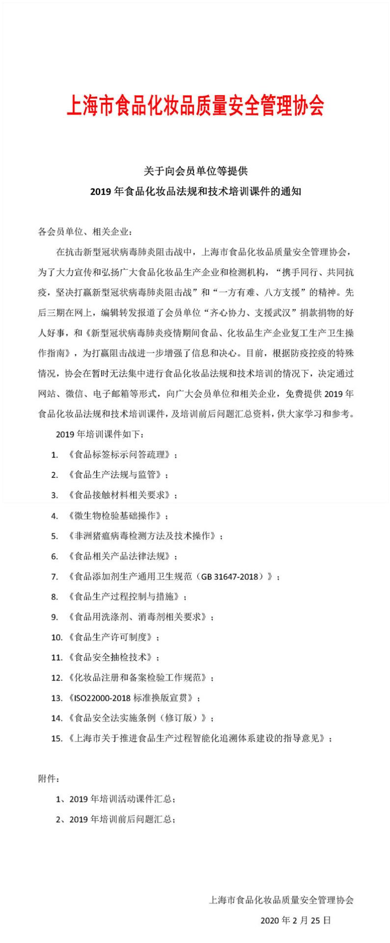 关于向会员单位等提供2019年食品化妆品法规和技术培训课件的通知