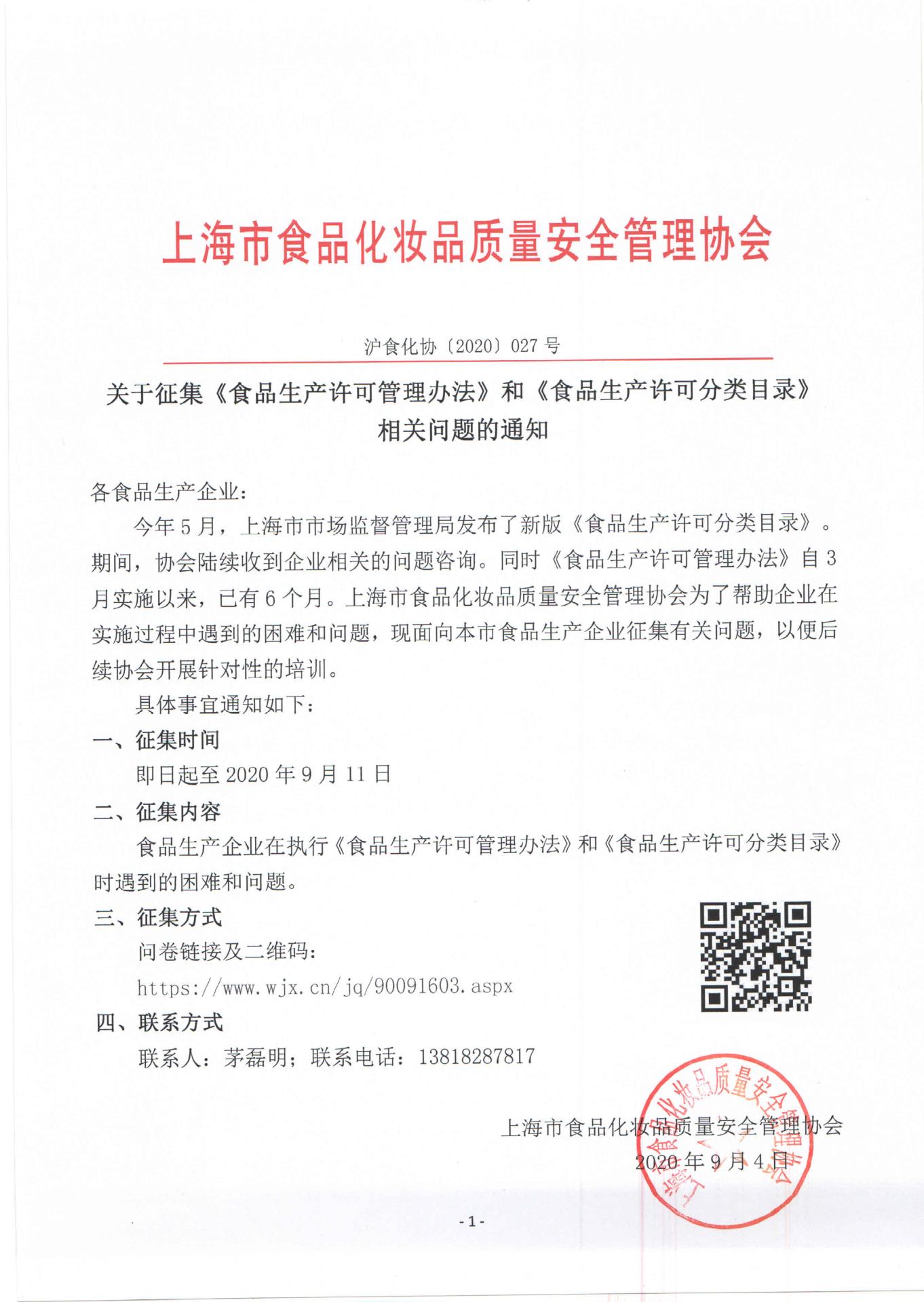 关于征集《食品生产许可管理办法》和《食品生产许可分类目录》相关问题的通知