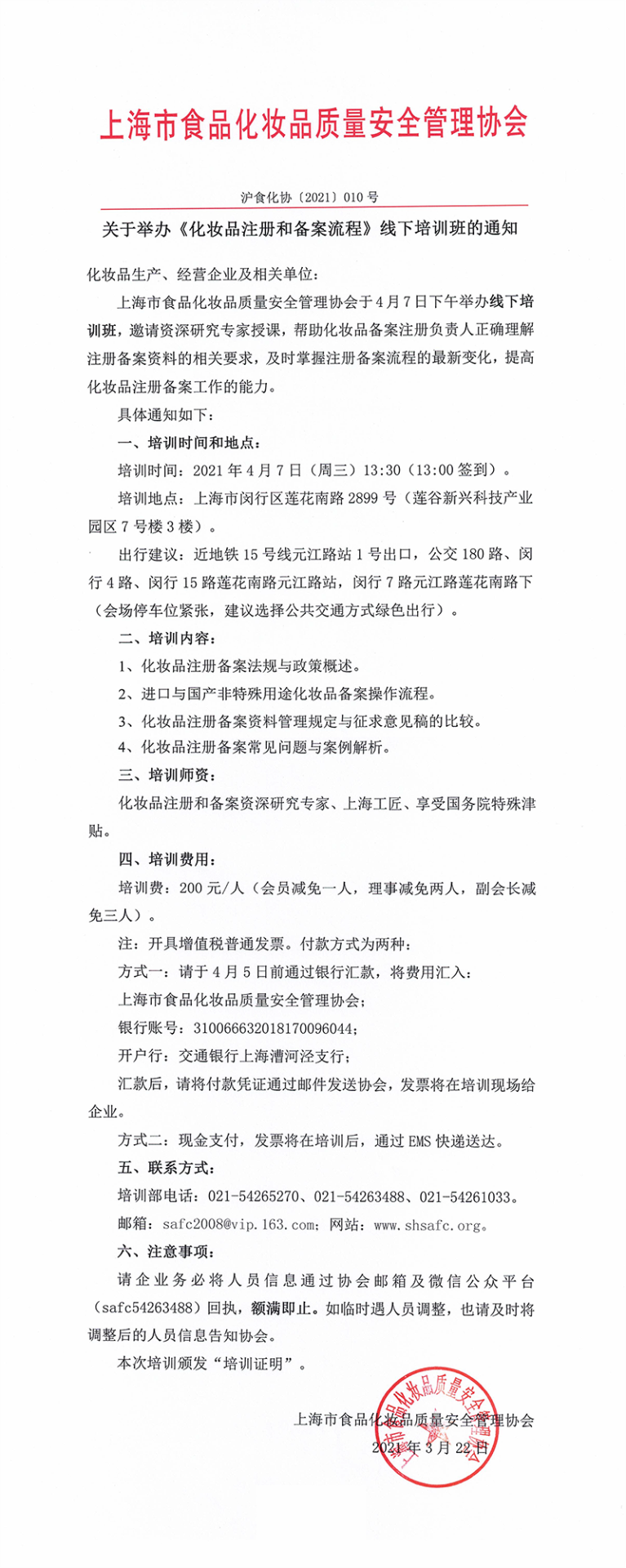 关于举办《化妆品注册和备案流程》线下培训班的通知