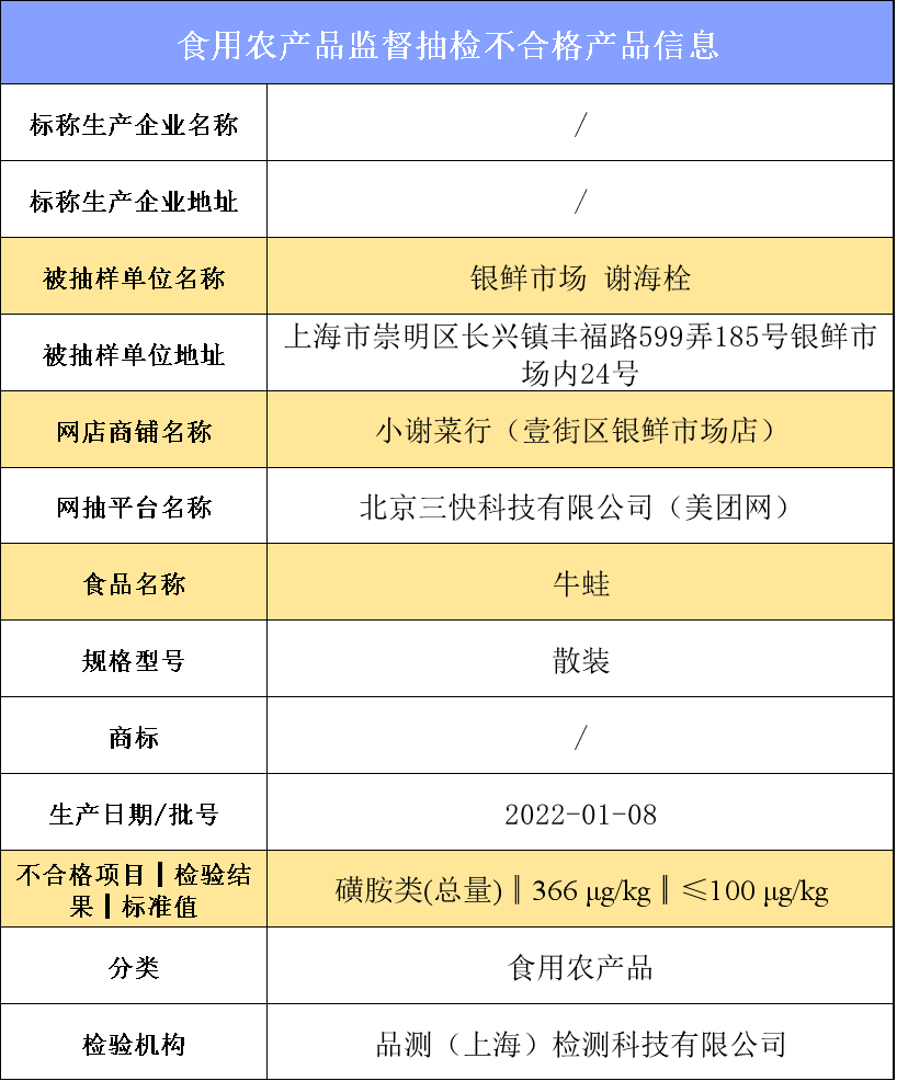银鲜市场 谢海栓在美团网上销售的牛蛙[不合格项目:磺胺类(总量)]。