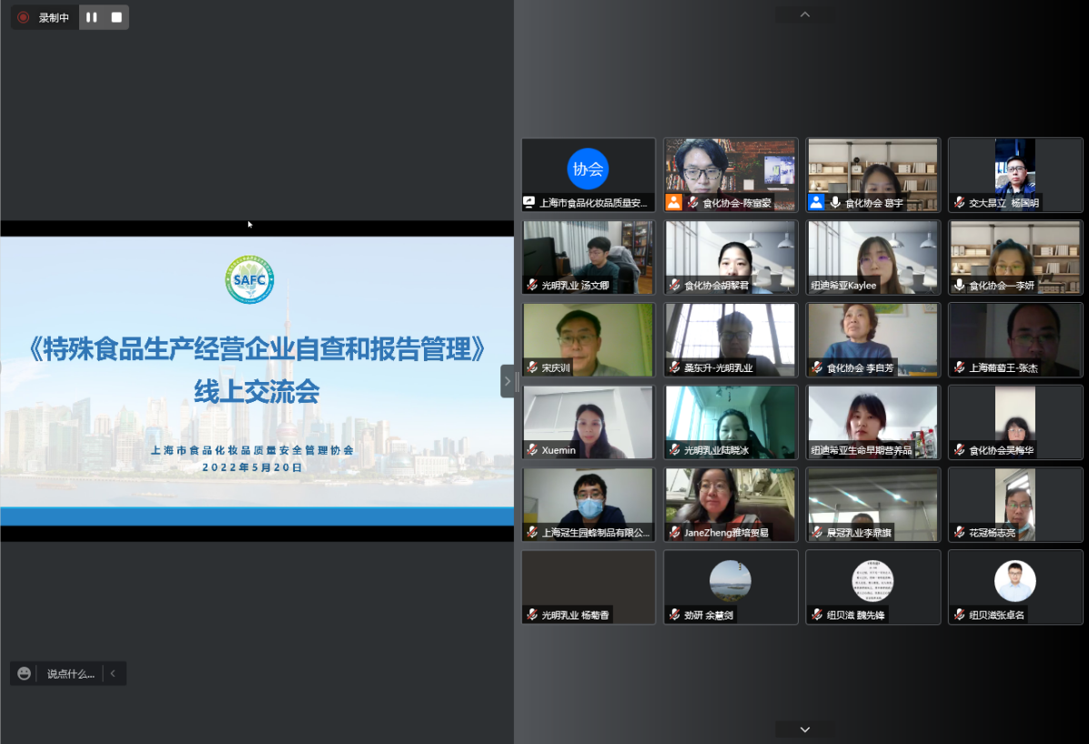 为方便特殊食品生产经营企业更好地贯彻落实《上海市食品化妆品质量安全管理协会特殊食品生产经营企业自查和报告管理规定》,2022年5月20日(周五),协会组织召开线上会议交流该项规定,上海市食品化妆品质量安全管理协会特殊食品安全监督管理处、部分特殊食品生产经营企业、协会专家及秘书处相关人员通过“腾讯会议”直播间参加了会议。