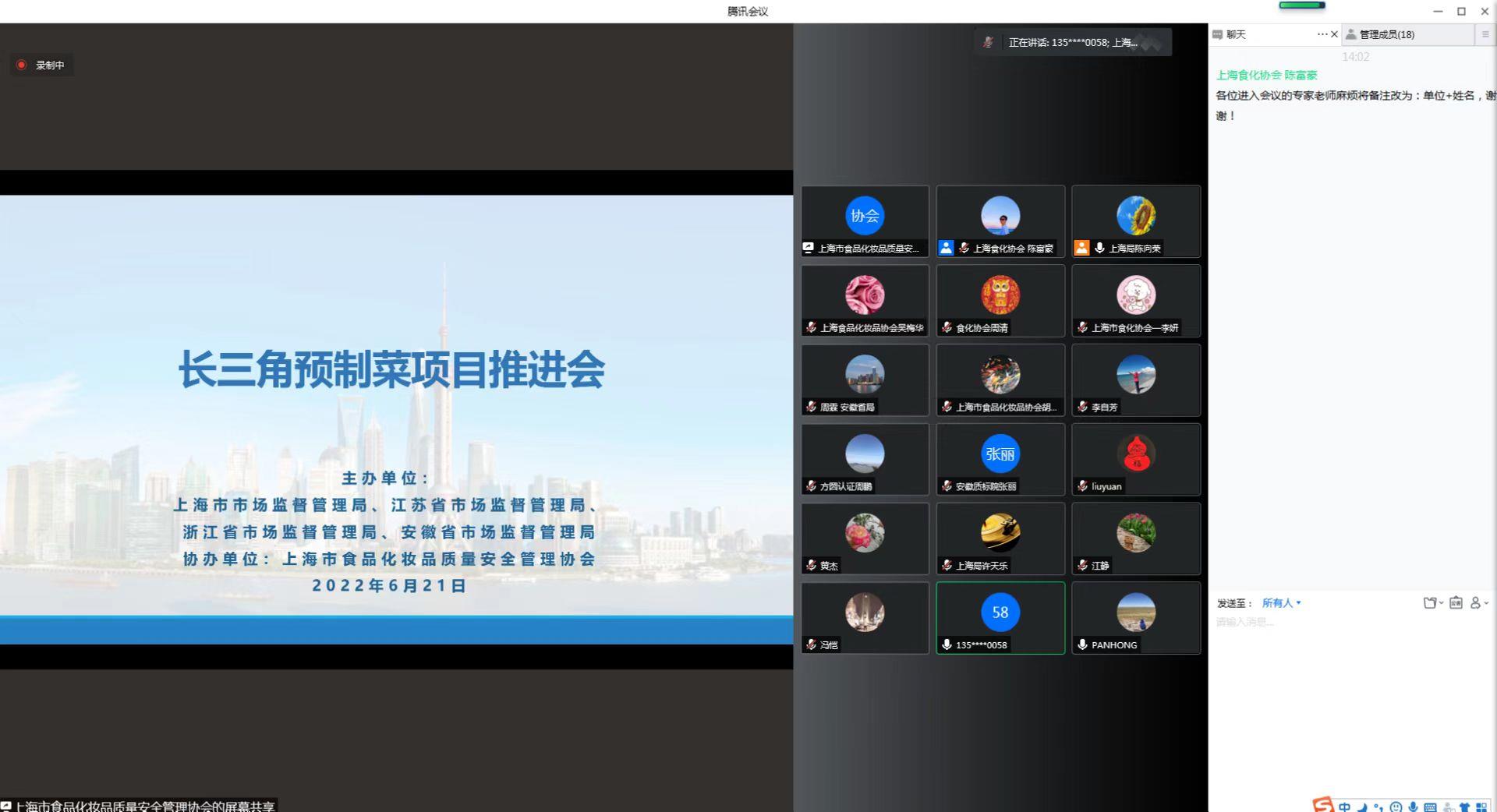 为尽快制定《长三角预制菜生产许可审查方案》,高标准、高质量推动长三角地区预制菜行业健康发展, 2022年6月21日,上海市、江苏省、浙江省、安徽省市场监管部门组织相关专家召开长三角预制菜项目工作推进会。协会秘书处参加了本次会议。