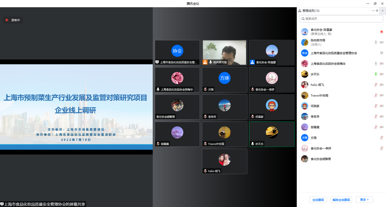 为调查上海市预制菜生产行业的现状,查找分析行业共性问题及其成因,并研究解决监管对策,从而促进预制菜生产行业健康有序发展,2022年7月18日,协会在上海市市场监管局指导下,组织参加了上海市预制菜企业线上调研,了解食品生产企业关于预制菜生产的相关情况,听取相关意见和建议。市局食品生产安全监督管理处相关领导、上海市部分预制菜食品生产企业代表、协会专家及协会秘书处参加了本次会议。