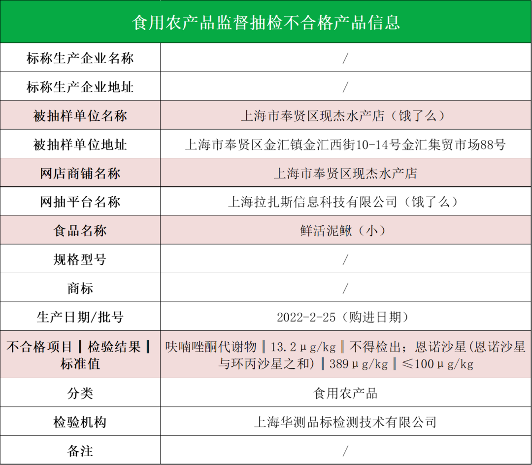 上海市奉贤区现杰水产店(经营者为上海市奉贤区现杰水产店)在网店销售的鲜活泥鳅(小)〔不合格项目:呋喃唑酮代谢物和恩诺沙星(恩诺沙星与环丙沙星之和)〕。