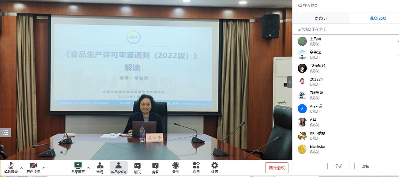 2023年1月12日,协会在上海市食品化妆品质量安全管理协会食品生产安全监督管理处全程指导下,组织了2023年第一场线上公益培训——《食品生产许可审查通则(2022版)》解读,邀请高级工程师、上海市食品化妆品质量安全管理协会评价中心主任、长期从事食品生产许可工作的资深专家李自芳老师授课。
