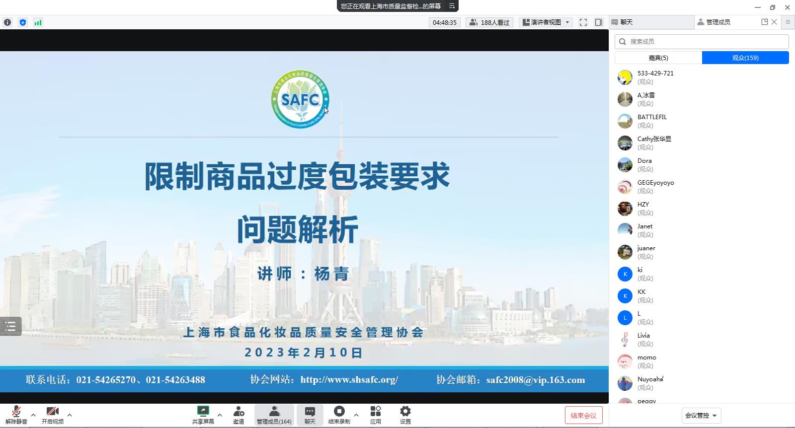 2023年2月10日,协会组织举办《限制商品过度包装问题解析》线上公益培训,邀请上海市质量监督检验技术研究院计量检测所商品量实验室负责人、高级工程师杨青老师授课。杨老师长期从事商品量及包装物减量计量监督抽查工作,有多年过度包装商品包装计量检验工作经验。 164名观众通过线上直播的方式参与了本次培训。