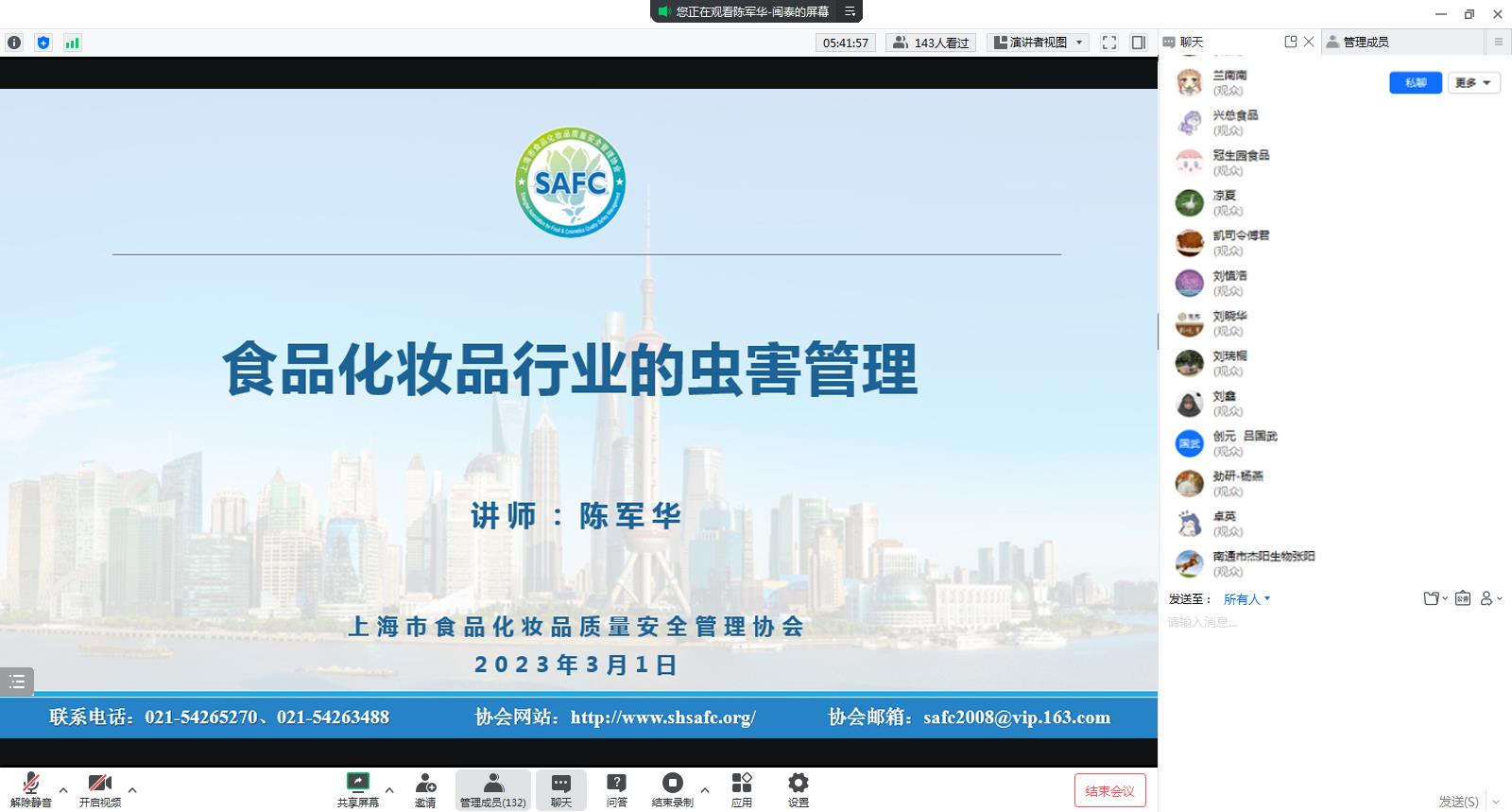 2023年3月1日,协会组织举办《食品化妆品行业的虫害管理》线上公益培训,邀请协会理事单位上海闽泰环境卫生服务有限公司,陈军华技术总监授课。132名相关行业人员通过线上直播的方式参与了本次培训。