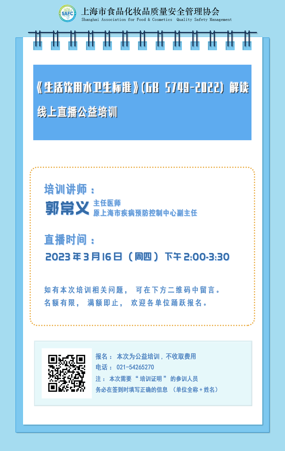 【公益培训】《生活饮用水卫生标准》》(GB 5749-2022)解读 线上直播公益培训-2023年3月16日
