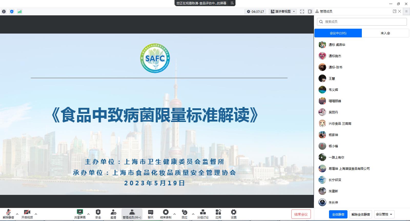 2023年5月19日,由上海市卫生健康委员会监督所主办、上海市食品化妆品质量安全管理协会承办的《食品中致病菌限量标准解读》线上公益培训,邀请国家食品安全风险评估中心专家授课。195名相关行业人员通过线上直播的方式参与了本次培训。