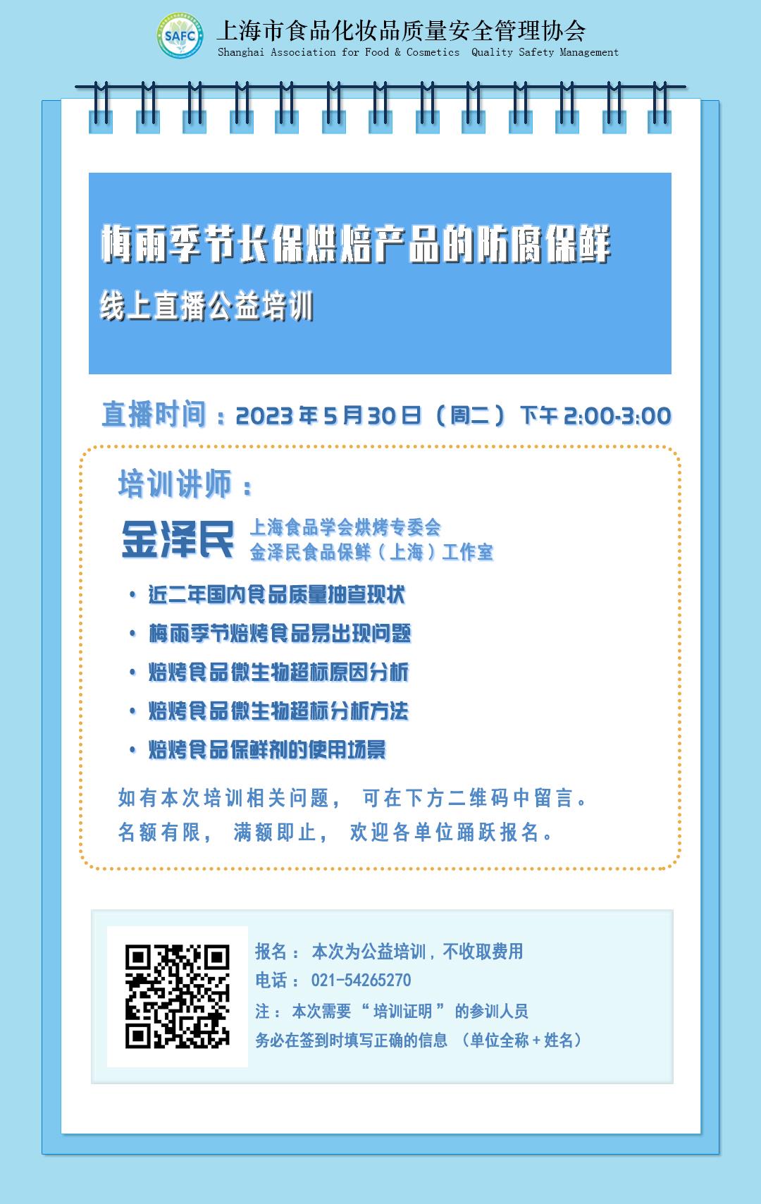 【公益培训】梅雨季节长保烘焙产品的防腐保鲜 线上直播公益培训——2023年5月30日
