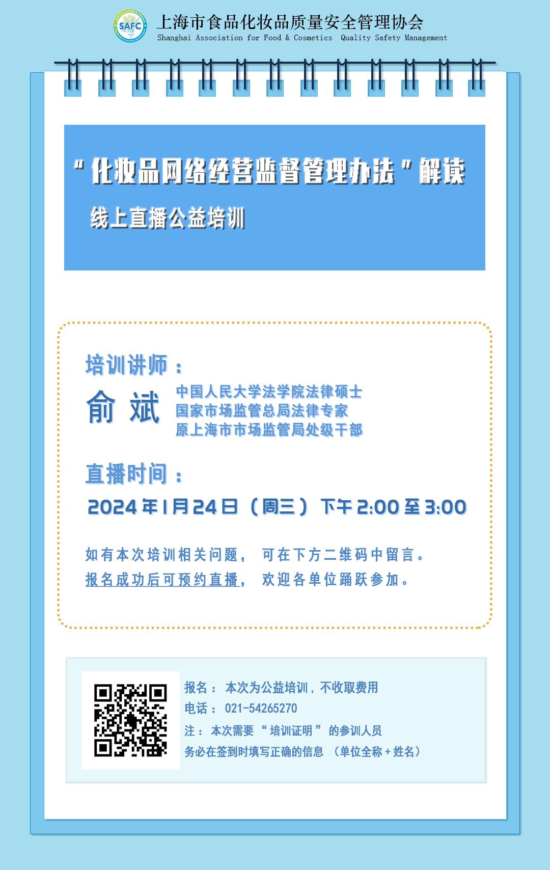 【公益培训】“化妆品网络经营监督管理办法”解读 线上直播公益培训——2024年1月24日