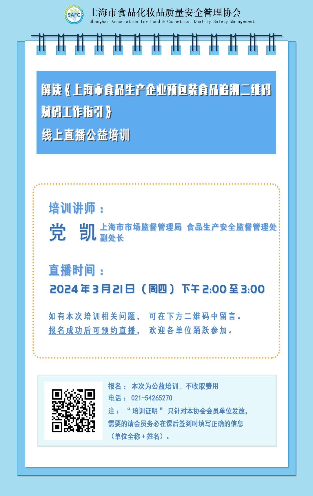 【公益培训】 解读《上海市食品生产企业预包装食品追溯二维码赋码工作指引》 线上直播公益培训——2024年3月21日