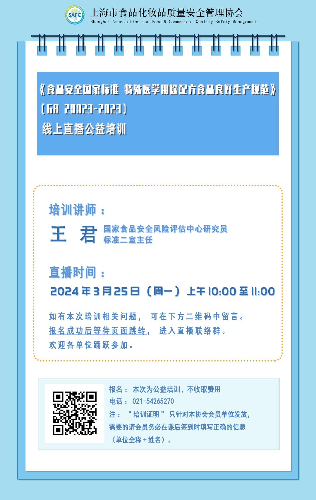 【公益培训】《食品安全国家标准 特殊医学用途配方食品良好生产规范》(GB 29923-2023) 线上直播公益培训——2024年3月25日