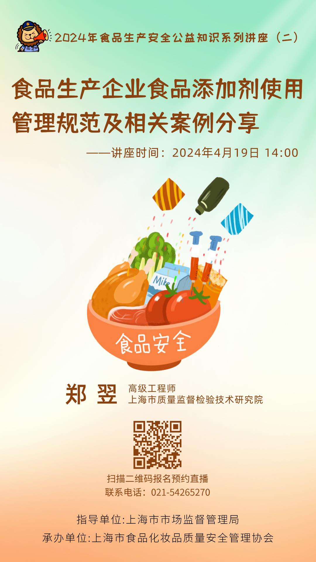 【公益讲座】2024年食品生产安全公益知识讲座 (二)《食品生产企业食品添加剂使用管理规范及相关案例分享》——2024年4月19日 14:00
