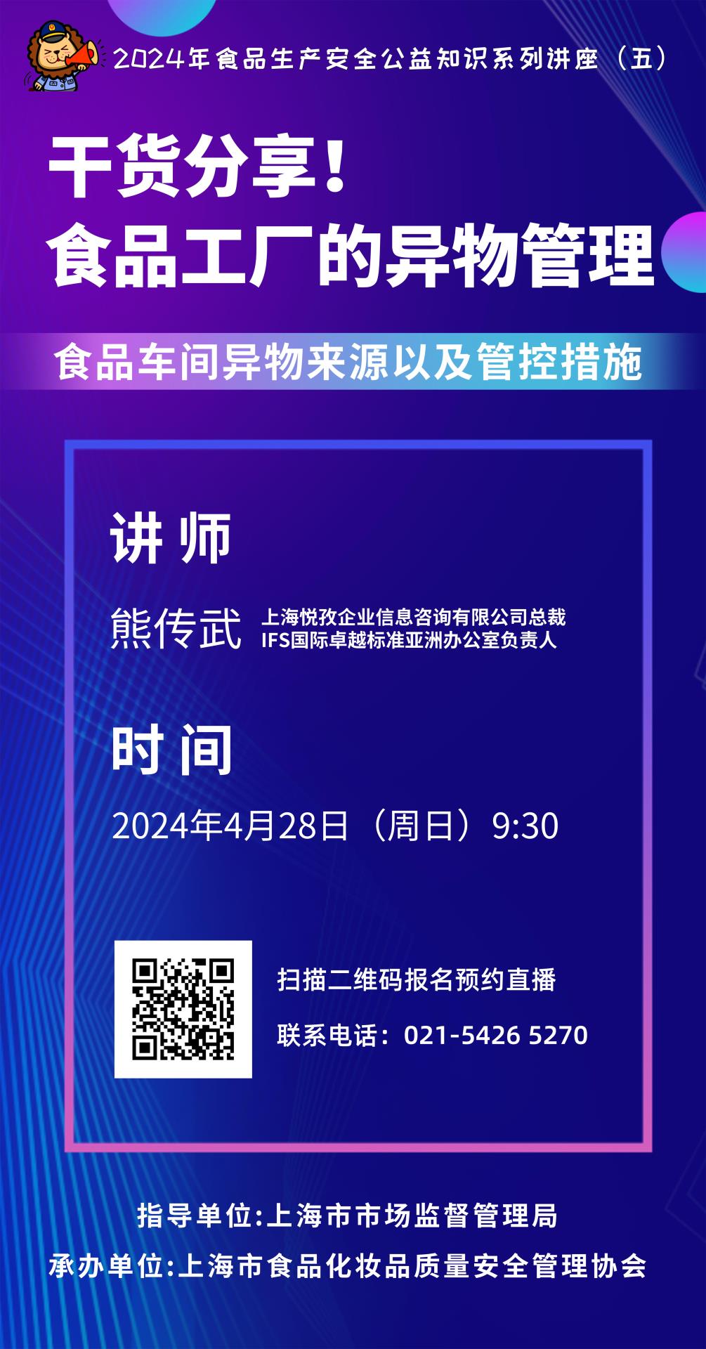 【公益讲座】2024年食品生产安全公益知识讲座(五)食品工厂的异物管理 ——2024年4月28日 9:30