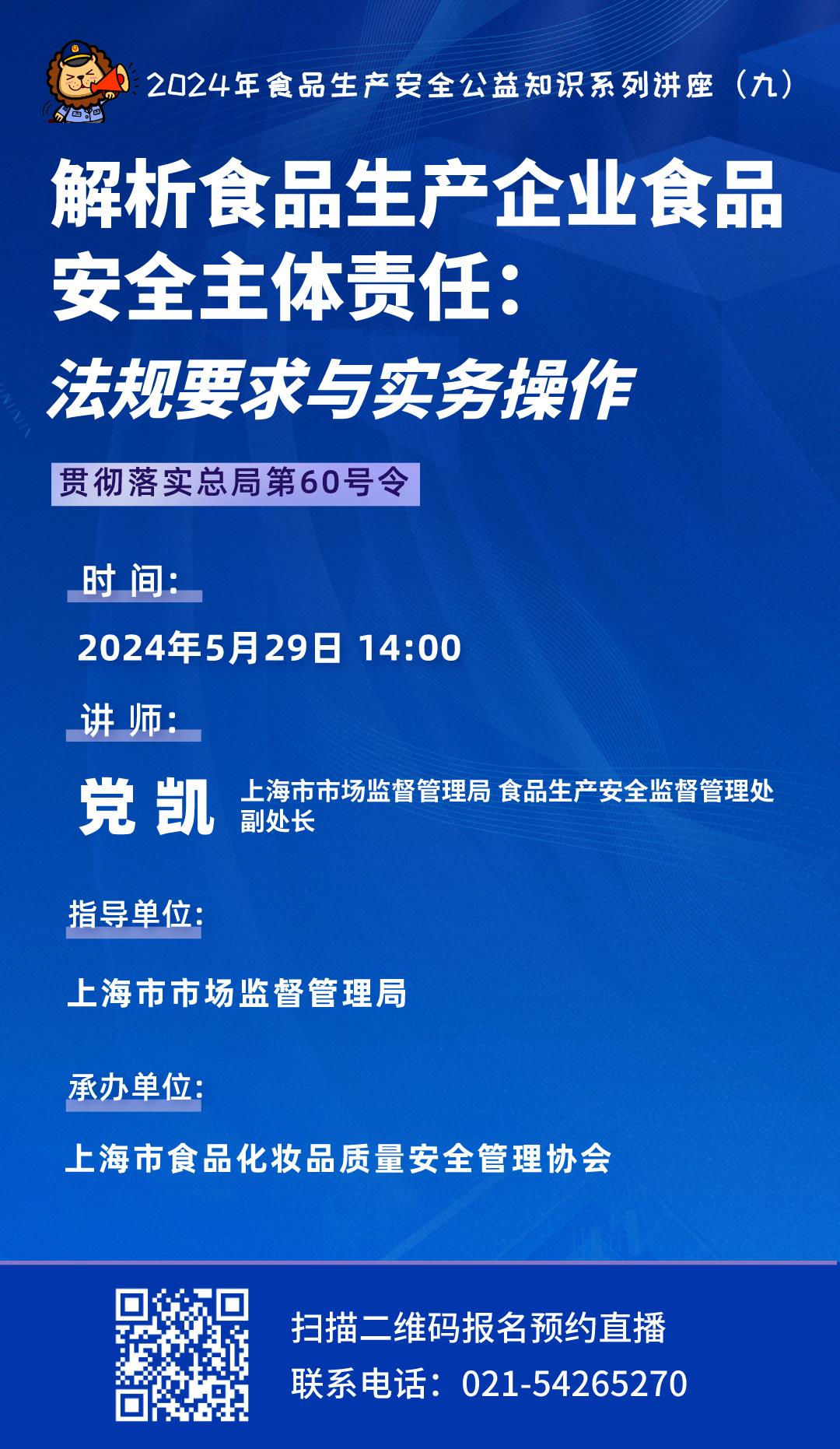 【公益讲座】2024年食品生产安全公益知识讲座(九)解析食品生产企业食品安全主体责任:法规要求与实务操作——2024年5月29日 14:00
