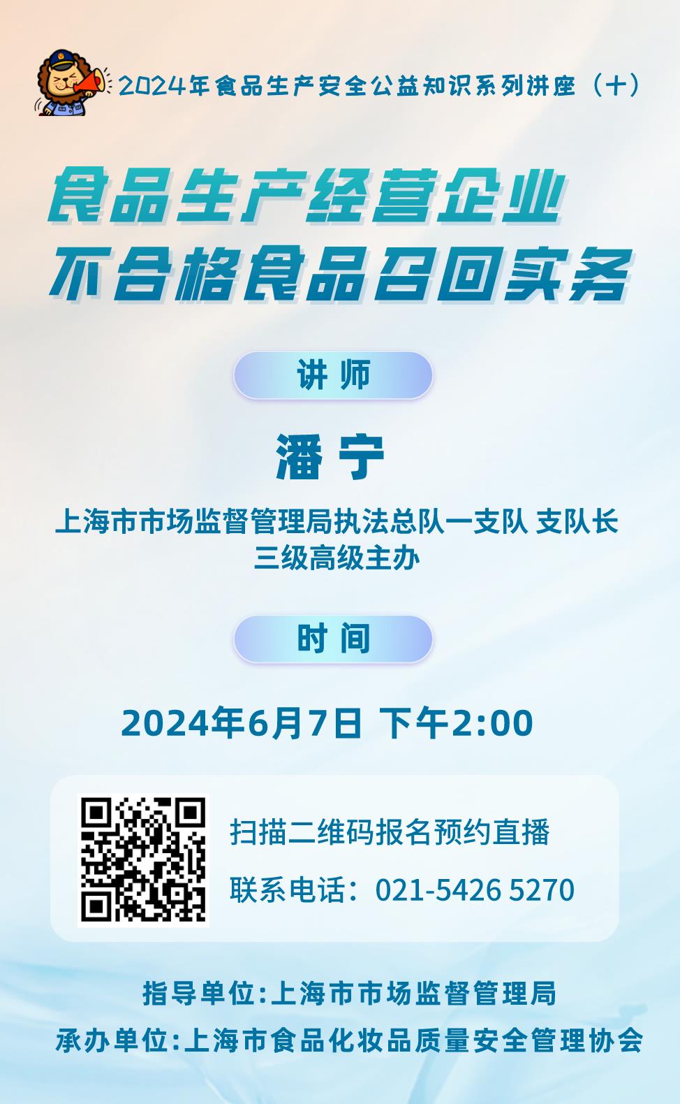 【公益讲座】2024年食品生产安全公益知识讲座(十)食品生产经营企业不合格食品召回实务——2024年6月7日 14:00