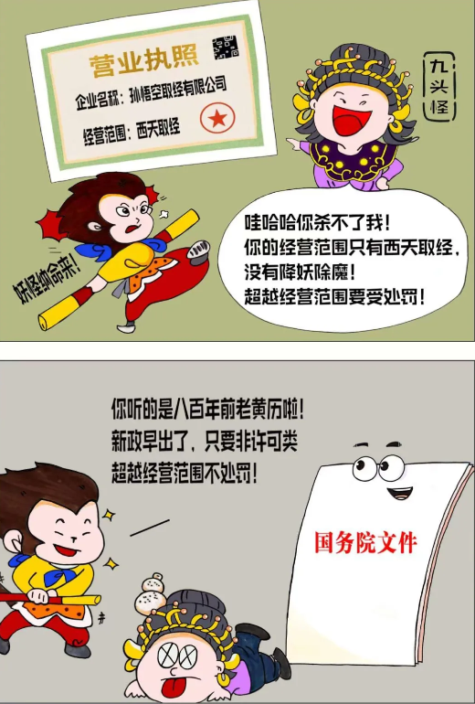 答:无需许可的经营项目,经营主体凭营业执照依法自主开展经营活动,企业超经营范围开展非许可类经营活动的,市场监管部门不予处罚;依法须经批准的项目,经相关部门批准后方可开展经营活动,具体经营项目以相关部门批准文件或许可证件为准。