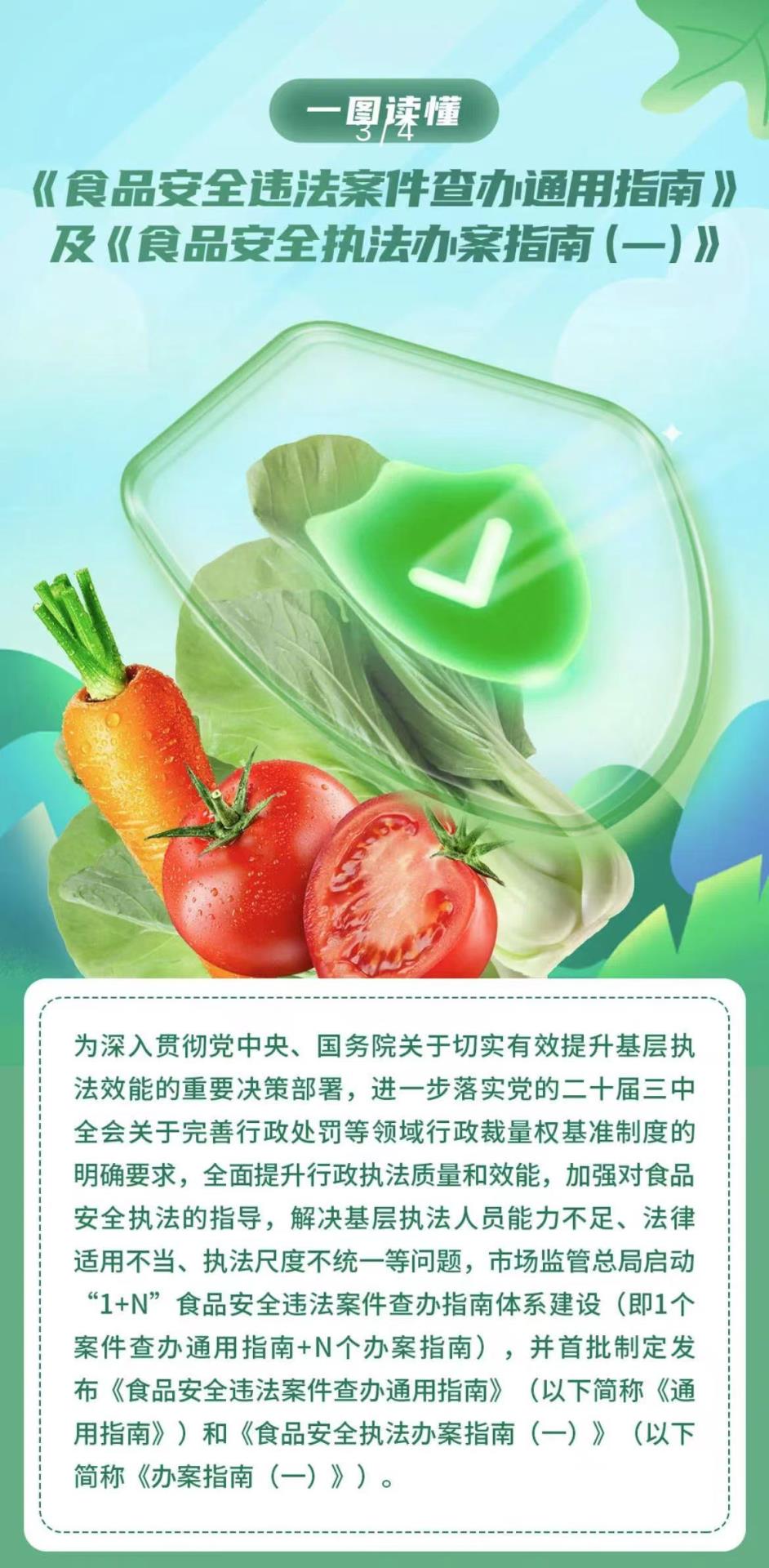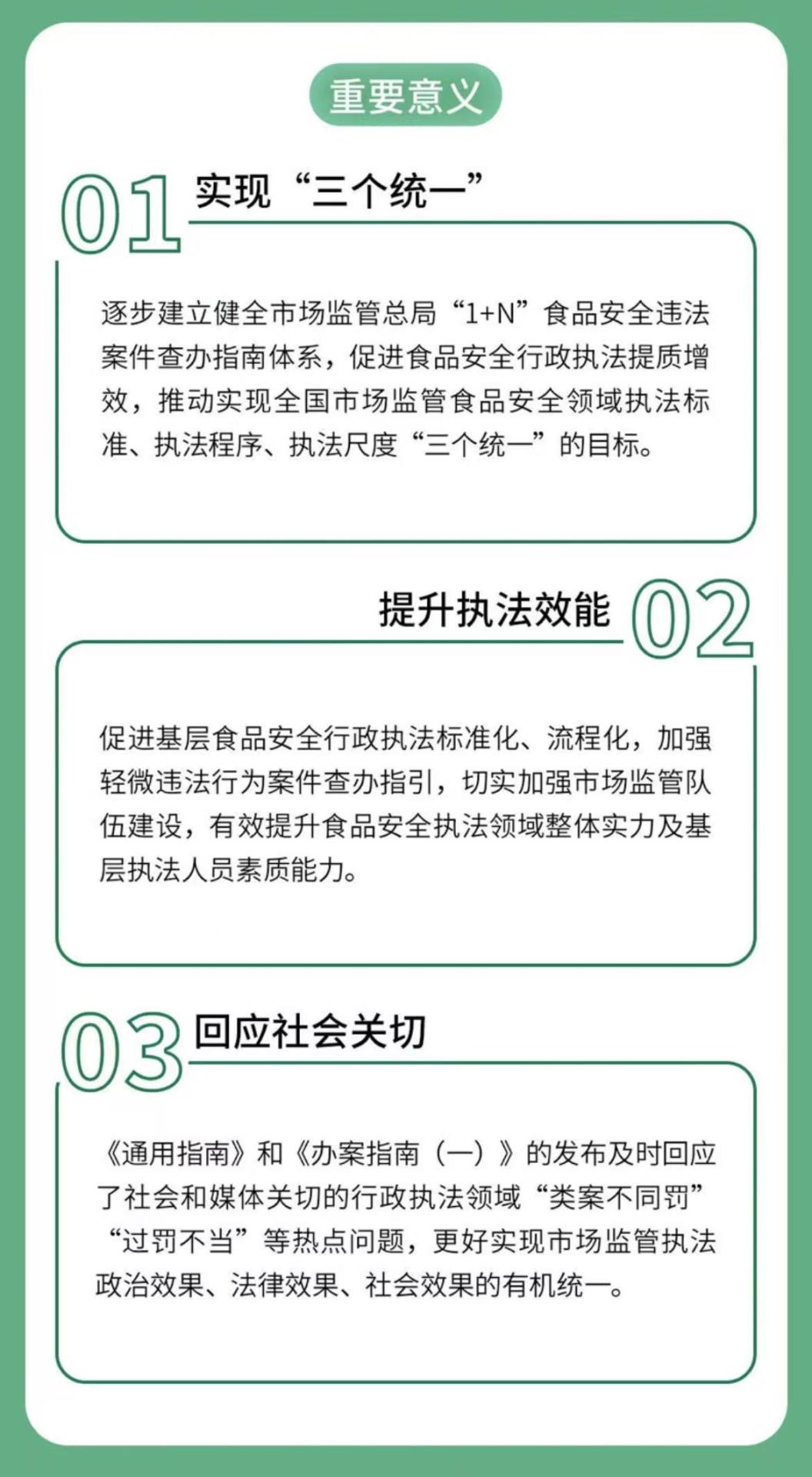 市场监管总局将以发布两个《指南》为契机,“手把手”为基层提供执法指导,推动实现全国市场监管食品安全领域执法标准、执法程序、执法尺度“三个统一”。持续推动后续执法指南的制定出台,完善“1+N”食品安全违法案件查办指南体系,切实加强对食品安全执法的指导,有效解决“类案不同罚”“过罚不当”等问题,进一步规范涉企执法行为,激发经营主体活力,更好实现政治效果、法律效果、社会效果的有机统一。