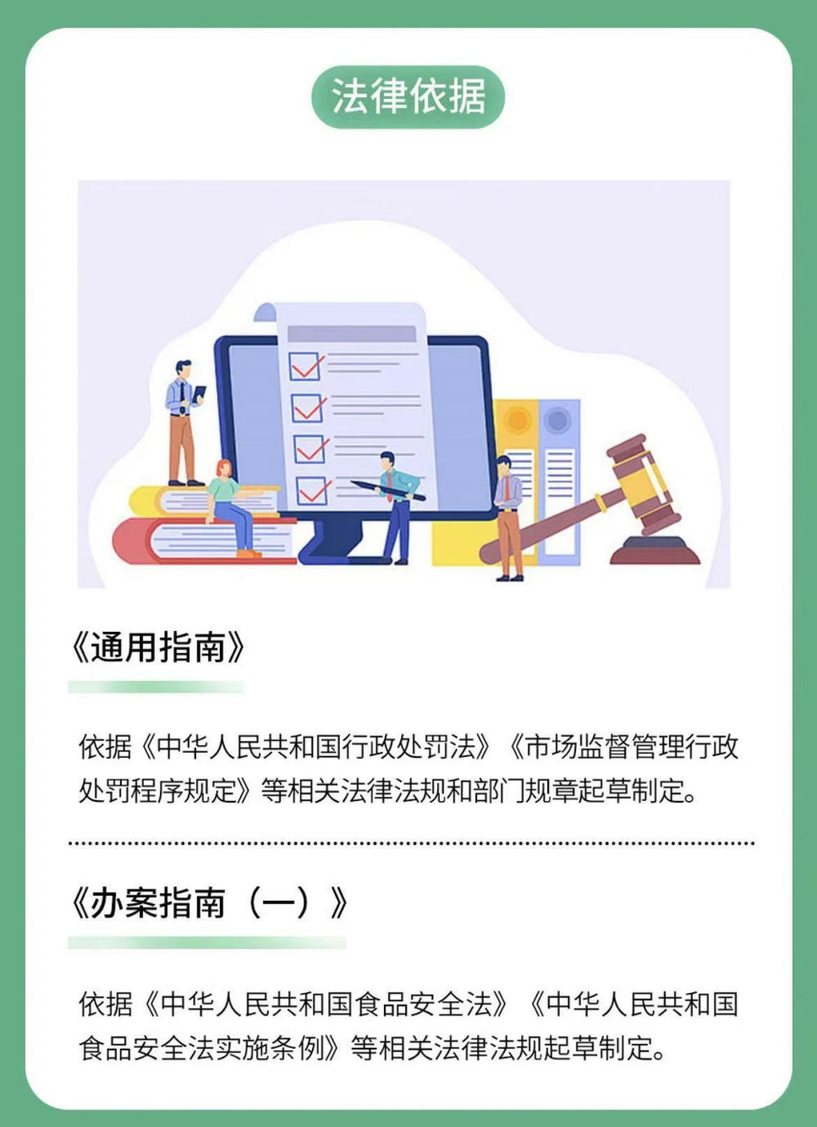 为切实有效提升基层执法效能,市场监管总局启动“1+N”食品安全违法案件查办指南体系建设(即1个案件查办通用指南+N个办案指南),并依据相关法律法规,近日首批制定发布了《食品安全违法案件查办通用指南》和《食品安全执法办案指南(一)》(以下简称两个《指南》)。