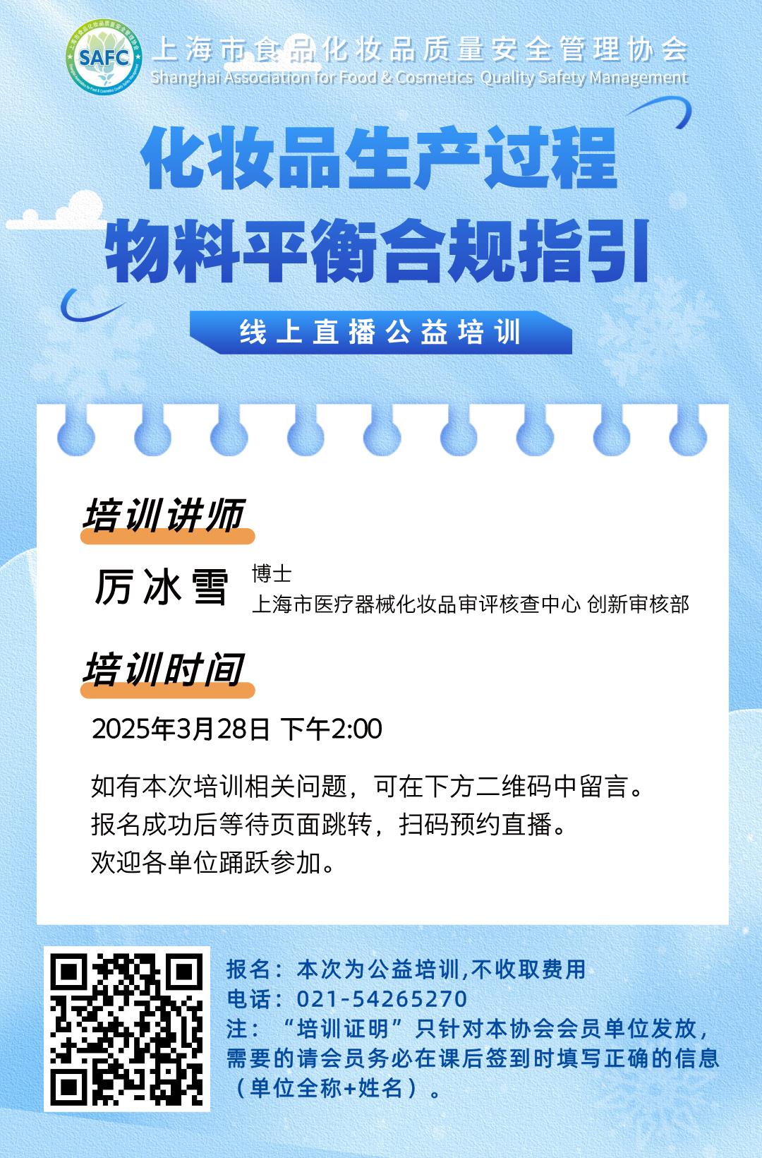 【公益培训】《化妆品生产过程物料平衡合规指引》 线上直播公益培训——2025年3月28日 14:00