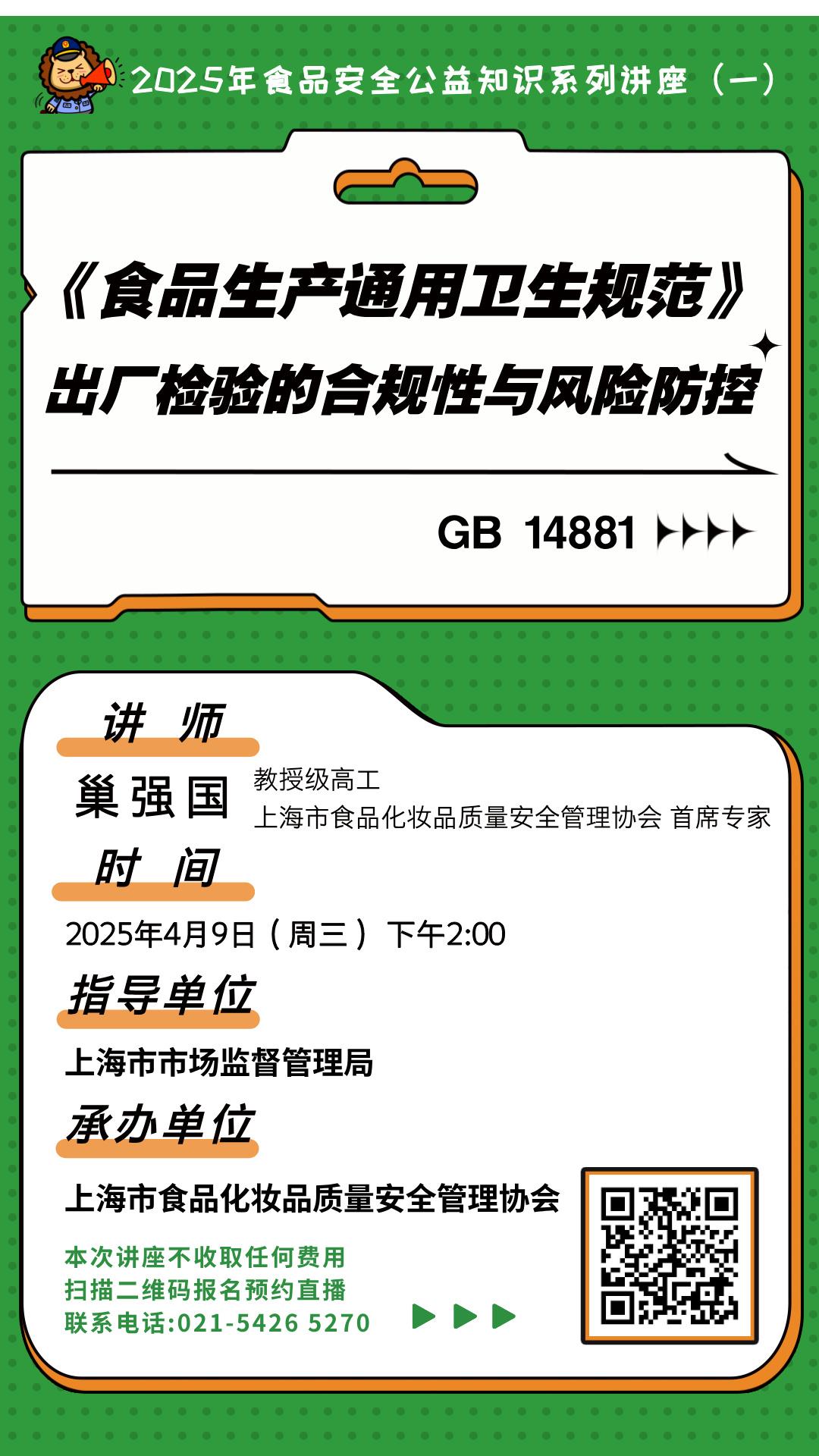 【公益讲座】2025年食品安全公益知识系列讲座(一)《食品生产通用卫生规范》出厂检验的合规性与风险防控 GB 14881 线上直播——2025年4月9日 14:00