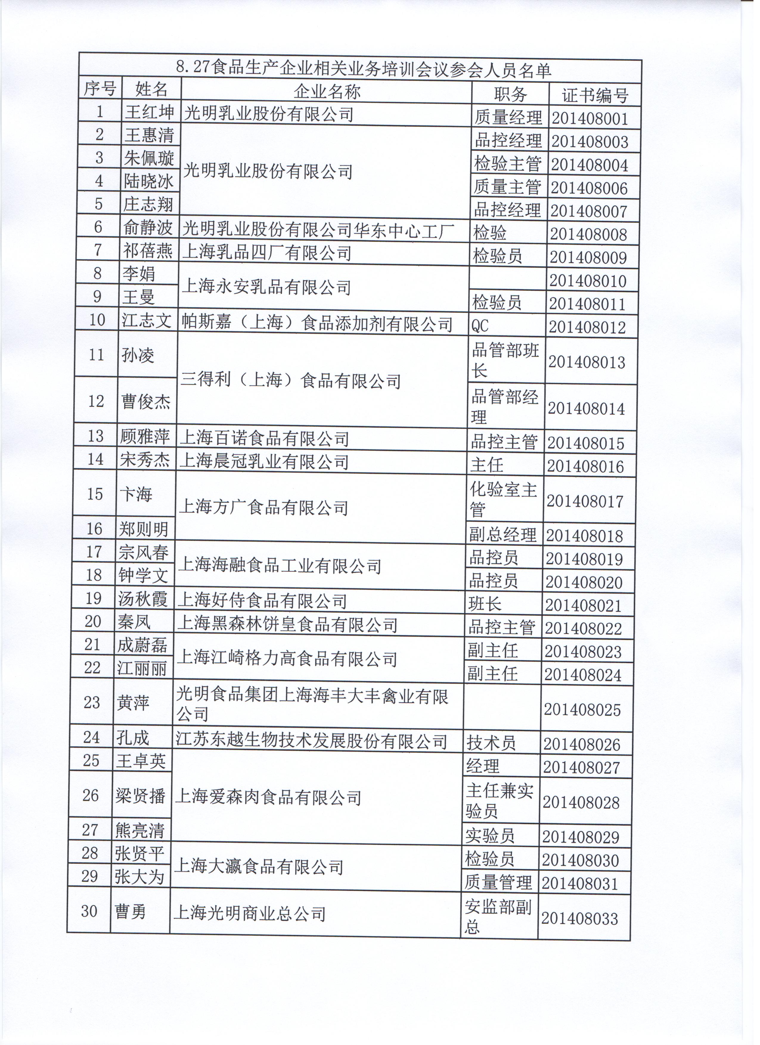 为积极配合上海市食品药品监督管理局开展的对本市食品生产企业出厂检验专项检查活动,上海市食品化妆品质量安全管理协会与上海市食品安全工作联合会食品生产专业委员会于2014年8月27日联合举办食品生产企业相关业务培训。