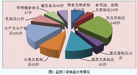 共监测10大类34小类599件I级食品样品。包括:粮食及粮食制品(45件)、食用油、油脂及其制品(24件)、肉及肉制品(148件)、蛋及蛋制品(25件)、蔬菜及其制品(65件)、水果及其制品(50件)、水产及水产制品(105件)、乳与乳制品(51件)、特殊膳食食品(37件)、餐饮食品(49件)等10大类(见图1)。
