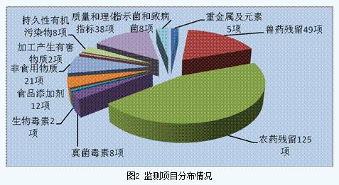 共监测11大类278个项目。包括:重金属和元素(5项)、兽药残留(49项)、农药残留(125项)、真菌毒素(8项)、生物毒素(2项)、食品添加剂(12项)、非食用物质(21项)、加工产生有害物质(2项)、持久性有机污染物(8项)、质量和理化指标(38项)、指示菌和致病菌(8项),共计30054项次(见图2)。