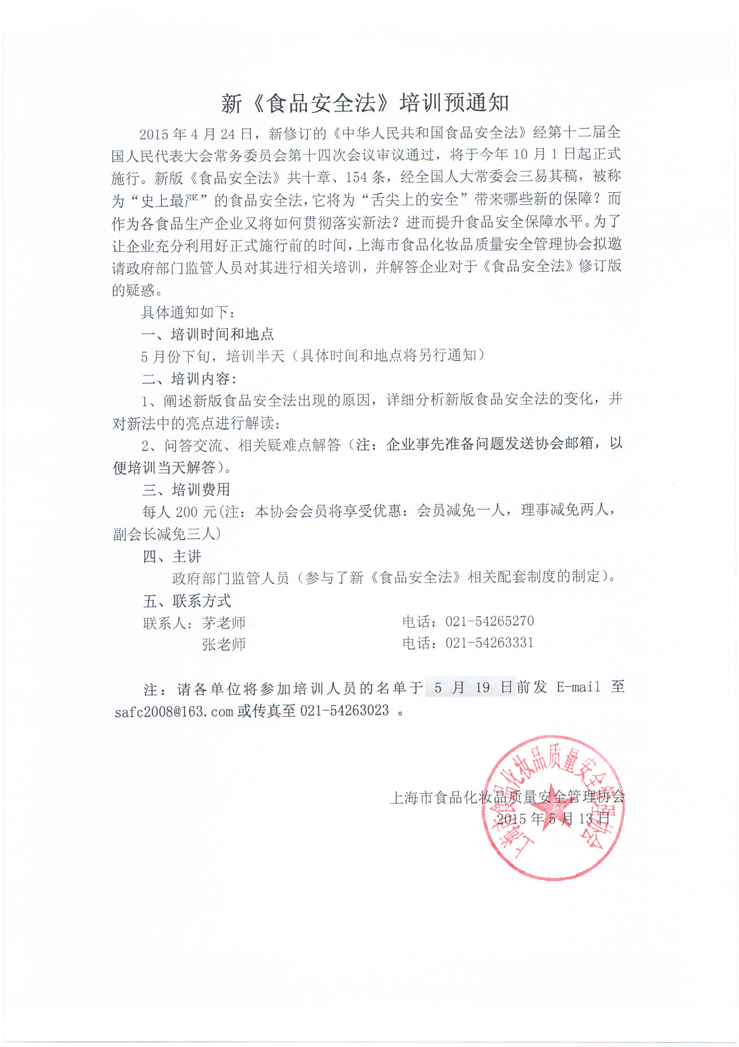 《食品安全法》修订版培训 预通知