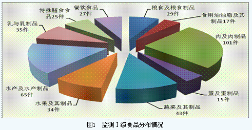 共监测10大类34小类391件I级食品样品。包括:粮食及粮食制品(29件)、食用油油脂及其制品(17件)、肉及肉制品(101件)、蛋及蛋制品(15件)、蔬菜及其制品(43件)、水果及其制品(34件)、水产及水产制品(65件)、乳与乳制品(35件)、特殊膳食食品(25件)、餐饮食品(27件)等10大类(见图1)。