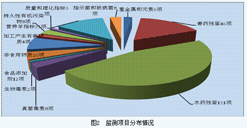共监测11大类283个项目16158项次。包括:重金属和元素(6项)、兽药残留(46项)、农药残留(131项)、真菌毒素(8项)、生物毒素(2项)、食品添加剂(12项)、非食用物质(20项)、加工产生有害物质(4项)、持久性有机污染物(8项)、质量和理化指标(3项)、营养学指标(35项)、指示菌和致病菌(8项)(见图2)。