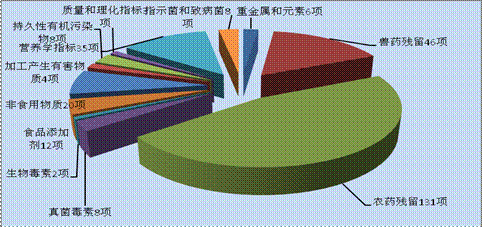 共监测12大类283个项目16124项次。包括:重金属和元素(6项)、兽药残留(46项)、农药残留(131项)、真菌毒素(8项)、生物毒素(2项)、食品添加剂(12项)、非食用物质(20项)、加工产生有害物质(4项)、持久性有机污染物(8项)、质量和理化指标(3项)、营养学指标(35项)、指示菌和致病菌(8项)(见图2)。