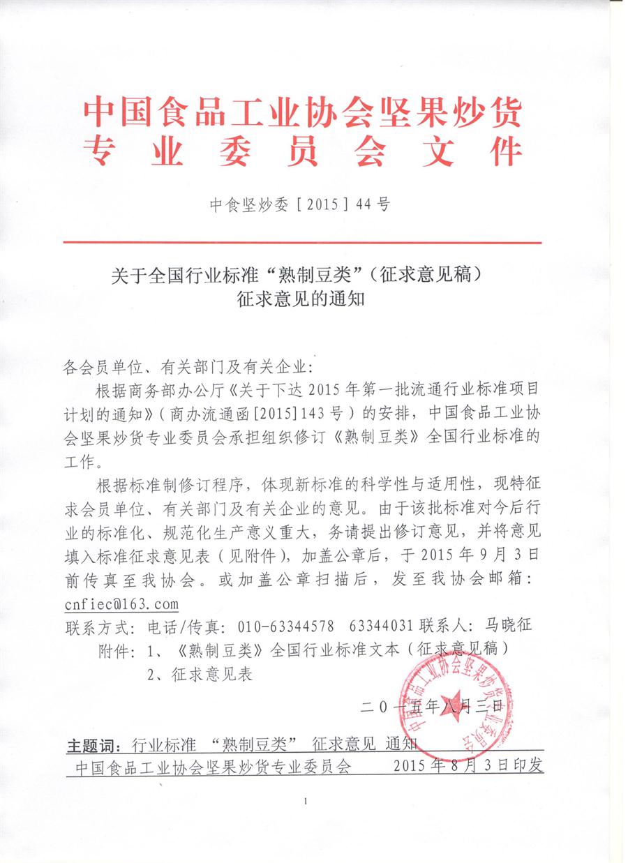 全国行业标准“熟制豆类”(征求意见稿)征求意见