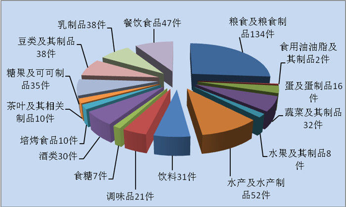 共监测16大类30小类511件Ⅱ级食品样品。包括:粮食及粮食制品(134件)、食用油及其制品(2件)、蛋及蛋制品(16件)、蔬菜及其制品(32件)、水果及其制品(8件)、水产及其制品(52件)、饮料(31件)、调味品(21件)、食糖(7件)、酒类(30件)、焙烤食品(10件)、茶叶及其制品(10件)、糖果及可可制品(35件)、豆类及其制品(38件)、乳制品(38件)、餐饮食品(47件)等16大类(见图1)。