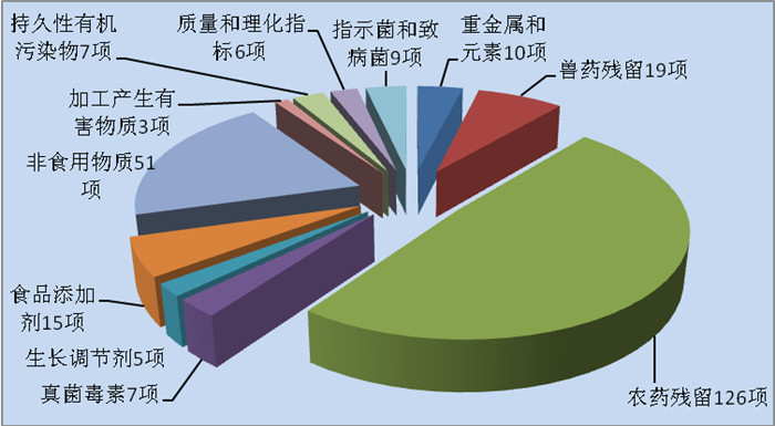 共监测10大类258个项目10170项次。包括:重金属和元素(10项)、兽药残留(19项)、农药残留(126项)、真菌毒素(7项)、生长调节剂(5项)、食品添加剂(15项)、非食用物质(51项)、加工产生有害物质(3项)、持久性有机污染物(7项)、质量和理化指标(6项)、指示菌和致病菌(9项)(见图2)。