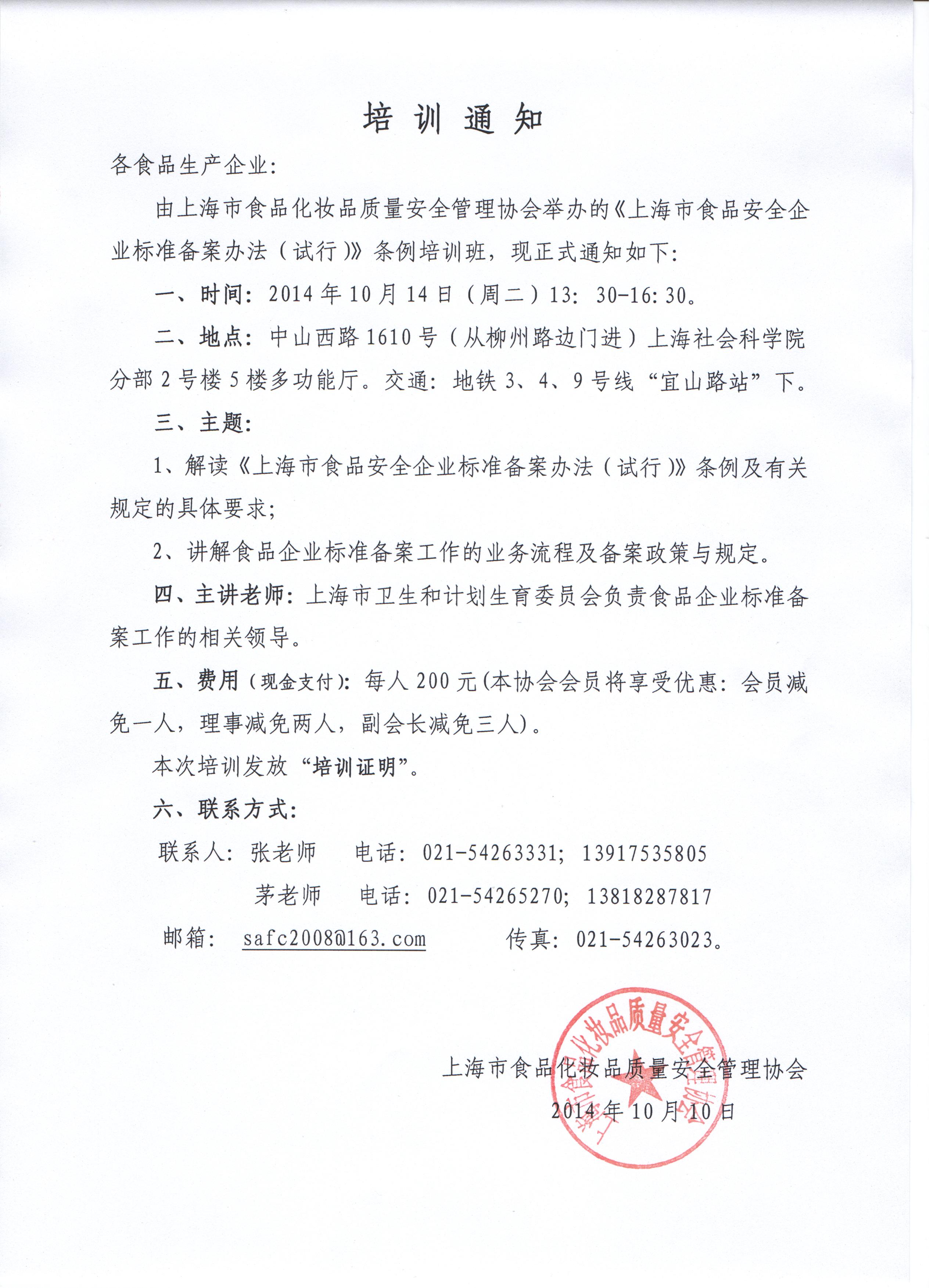 《上海市食品安全企业标准备案办法(试行)》条例培训班正式通知