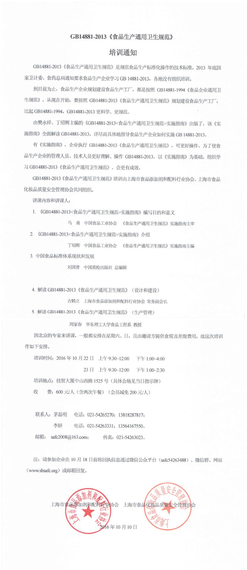 GB14881-2013《食品生产通用卫生规范》培训通知