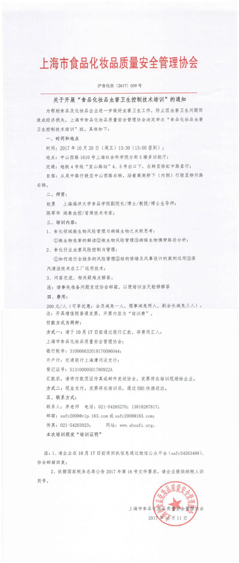 关于开展“食品化妆品虫害卫生控制技术培训”的通知