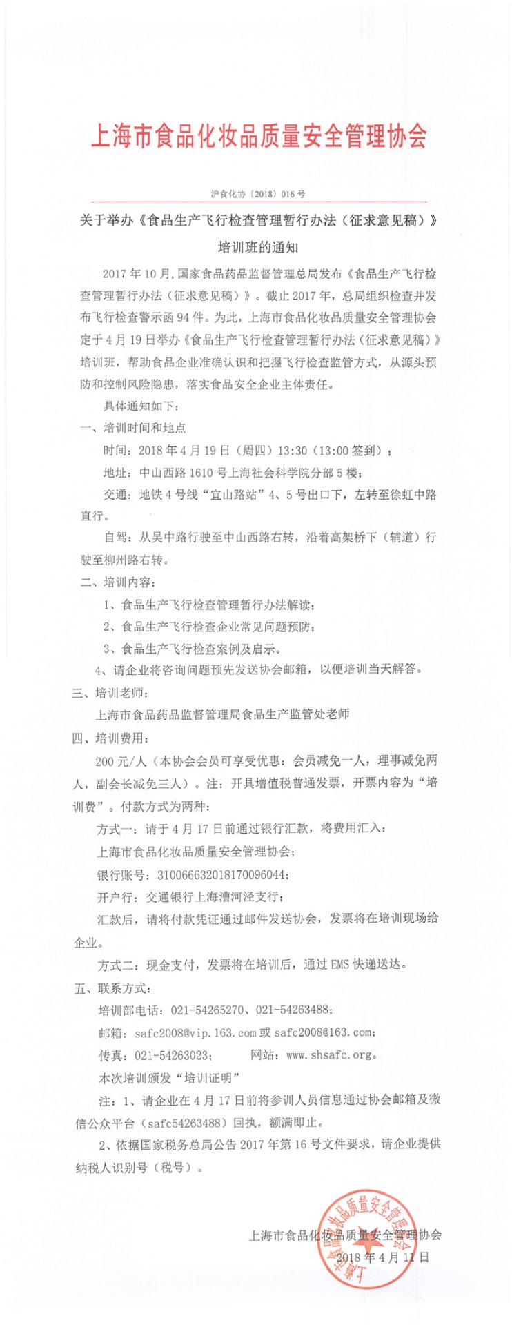 关于举办《食品生产飞行检查管理暂行办法(征求意见稿)》培训班的通知