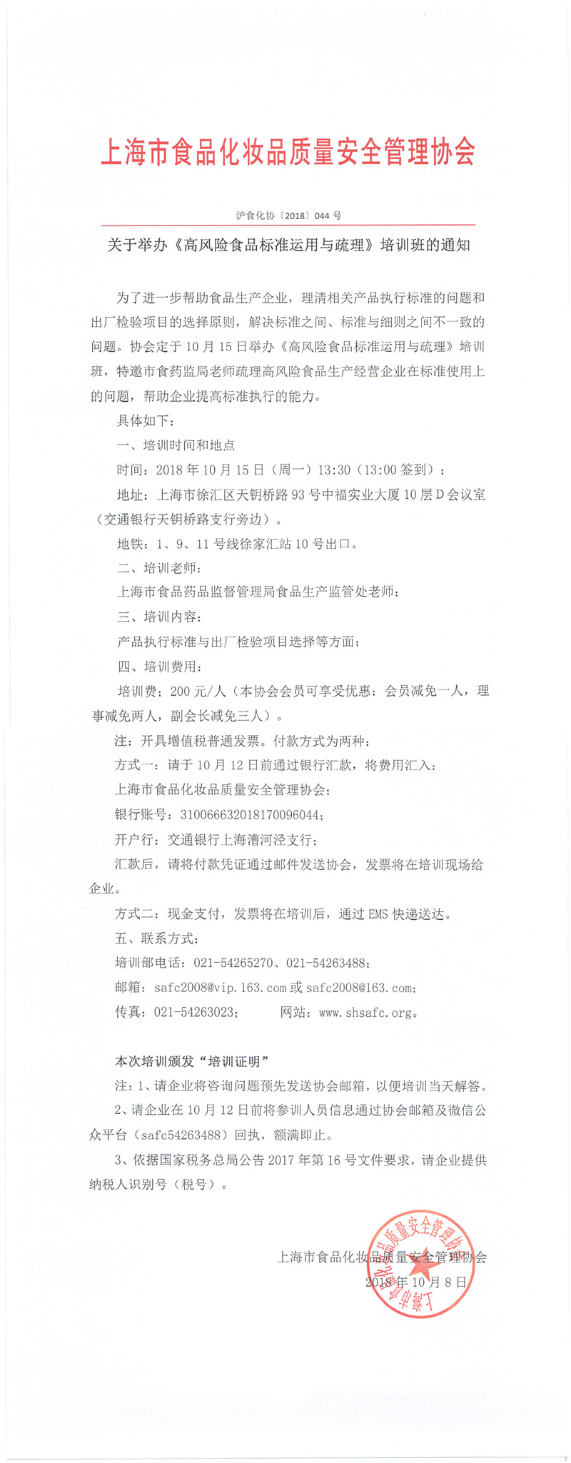 关于举办《高风险食品标准运用与疏理》培训班的通知