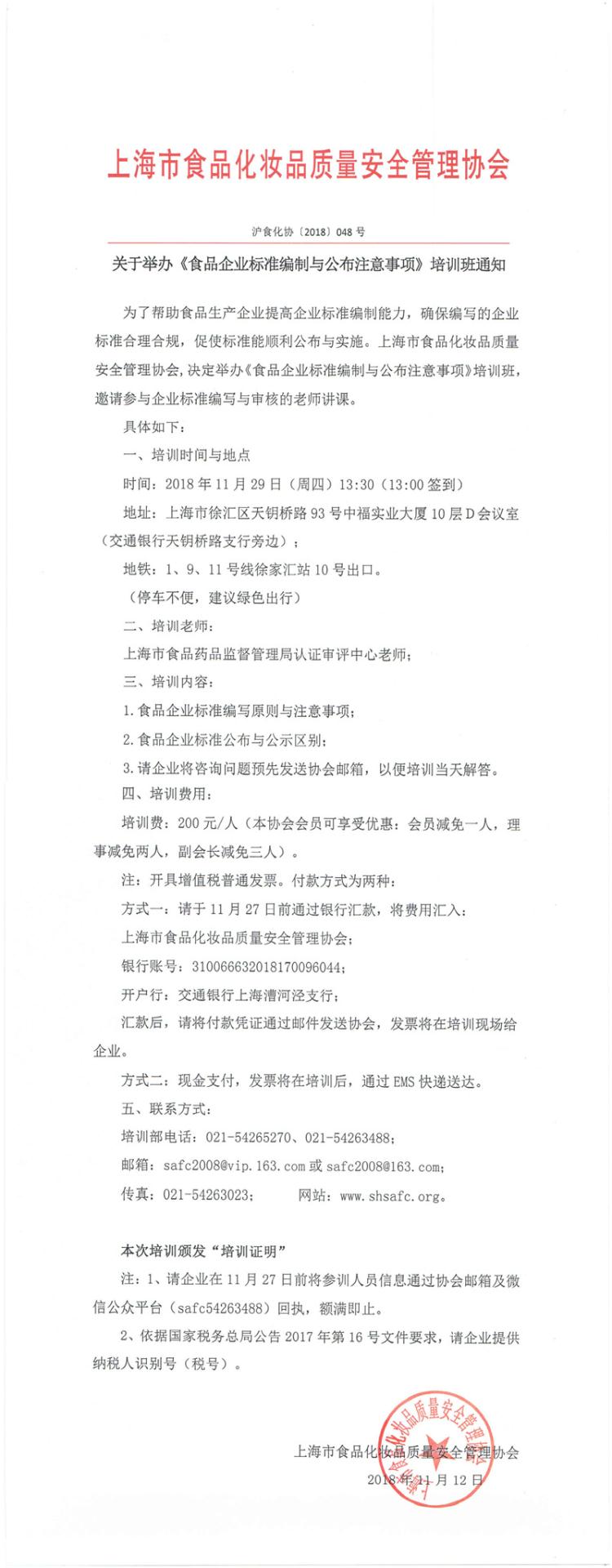 关于举办《食品企业标准编制与公布注意事项》培训班通知