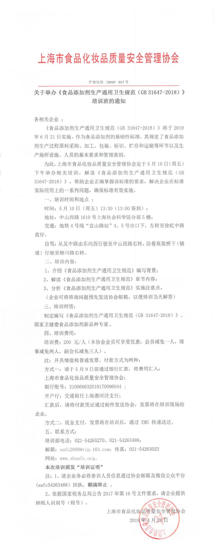 关于举办《食品添加剂生产通用卫生规范(GB 31647-2018)》培训班的通知