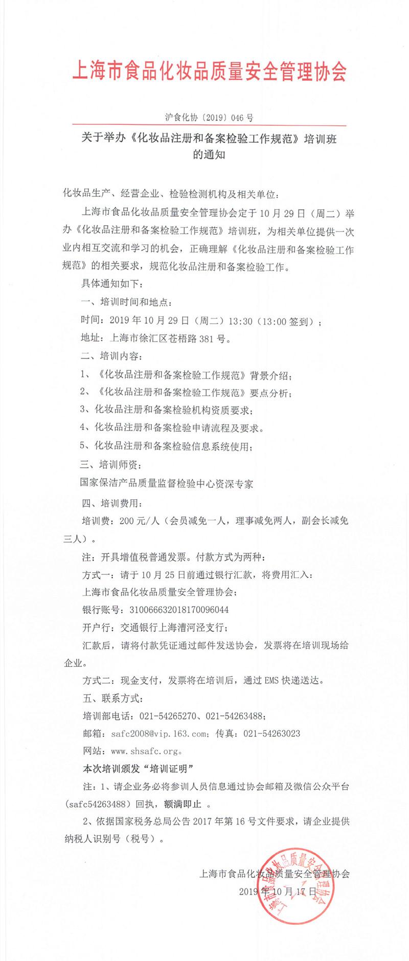 关于举办《化妆品注册和备案检验工作规范》培训班的通知